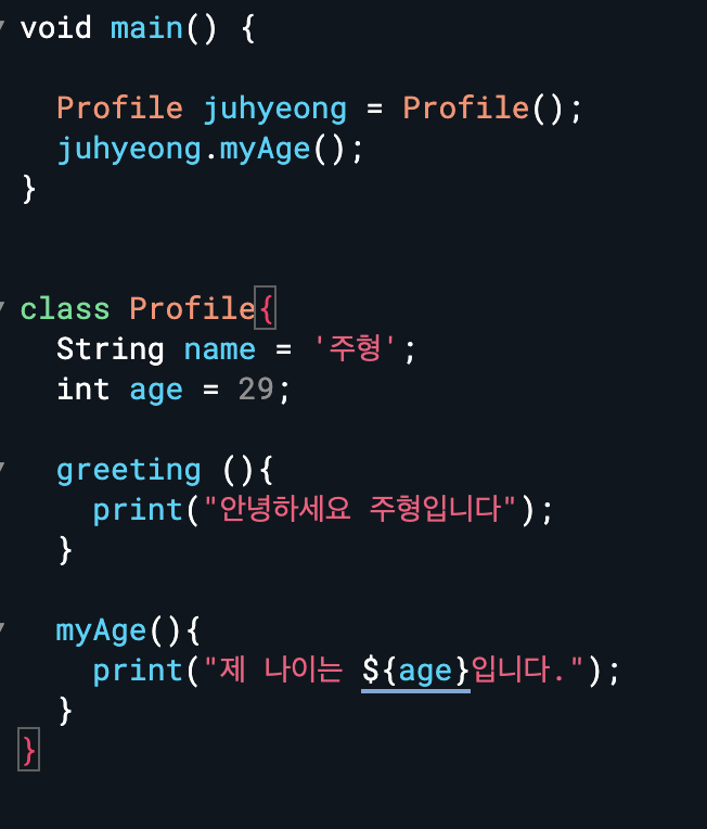 기본 변수 선언 방법 ( 타입과 함께 선언) void main() { var varible = 'anything' String str = '주형'; // 이상하게 String만 앞에 대문자 int integer = 3; double silsue = 2.344; // 실수 bool isTrue = true //True아니고 앞문자 소문자임 DateTime now = DateTime.now(); } ; 로 문장 끝나는거 꼭 표현해줘야함. C++의 향기가 물씬 난다. 그런데 var은 타입추론 물론 알아서 하지만, 변수 선언할 때 앞에다가 변수의 타입을 지정하면서 변수선언하는건 좋은듯. 문자열 안에 변수넣기. $ 인데, {} 생략이 가능한 print( '${name} ${age} ') //는 아래와 같다 pri..